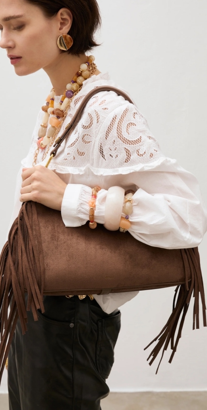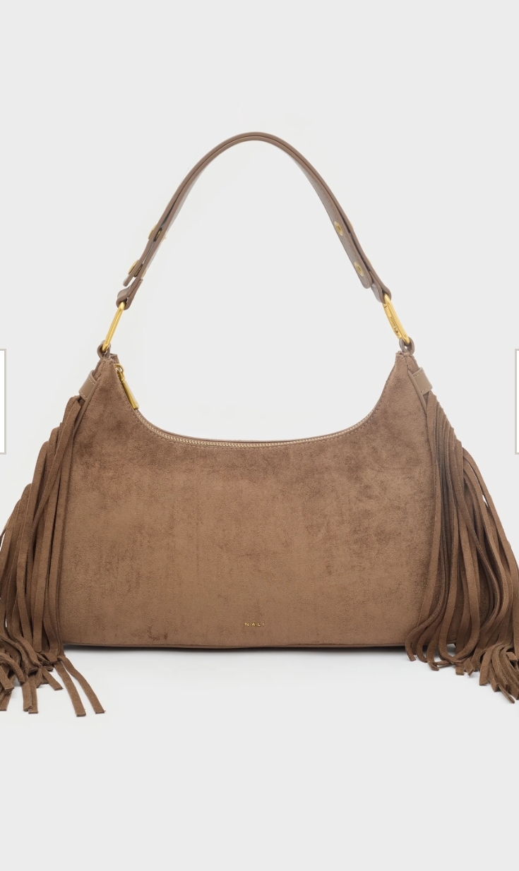 Borsa in eco scamosciato di Nalà con ornamenti di frange ai lati, con chiusura zip, e tracolla corta e lunga. Molto comoda può essere casual o eleganteÂ