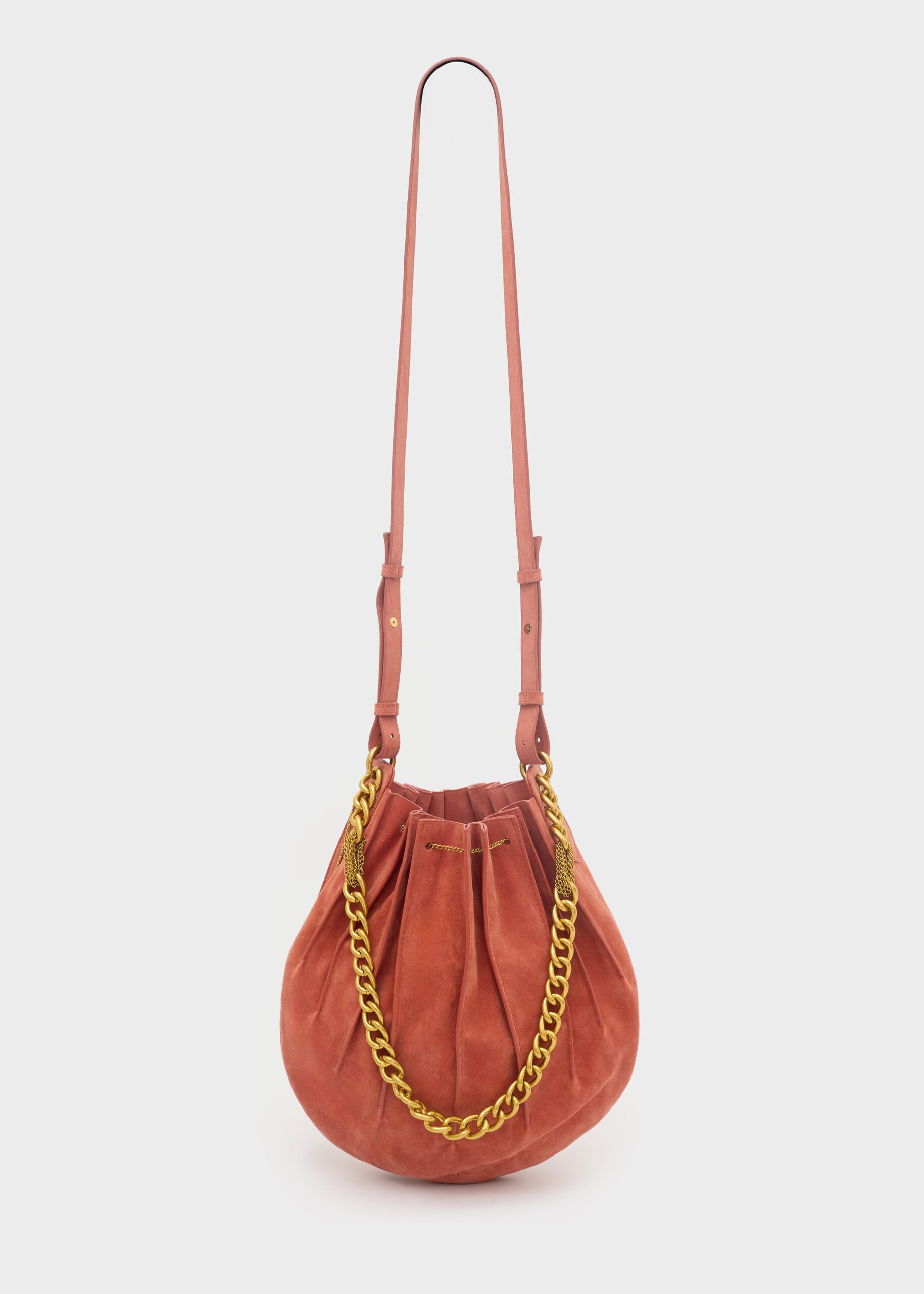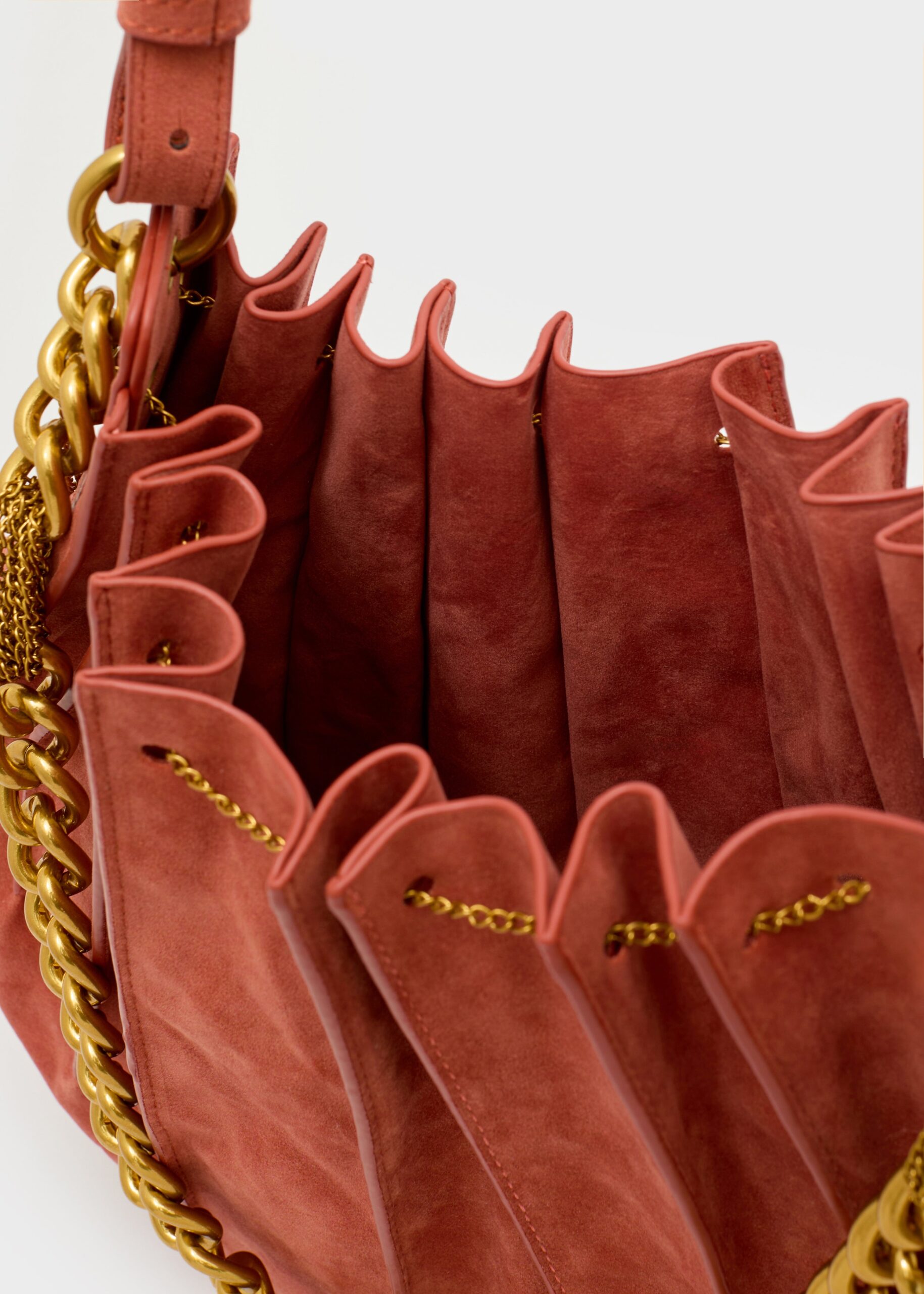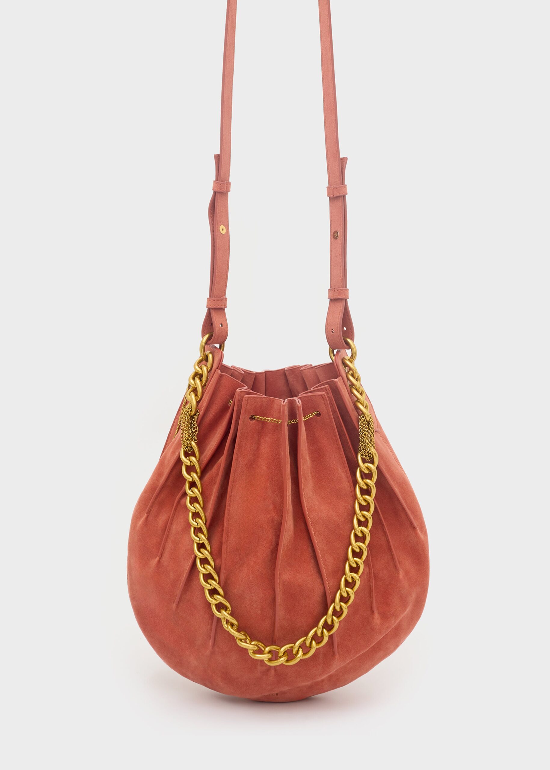 Borsa Evissa a spalla scamosciata, con tracolla a catena oro,a una forma a secchiello.