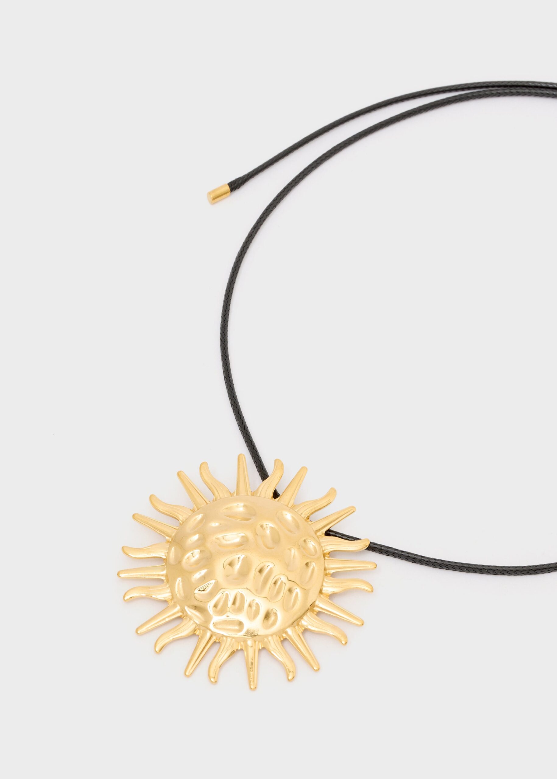 COLLANA di Nalí con cordino nero, e a forma di sole ideale da valorizzare un décolleté, in acciaio inox.