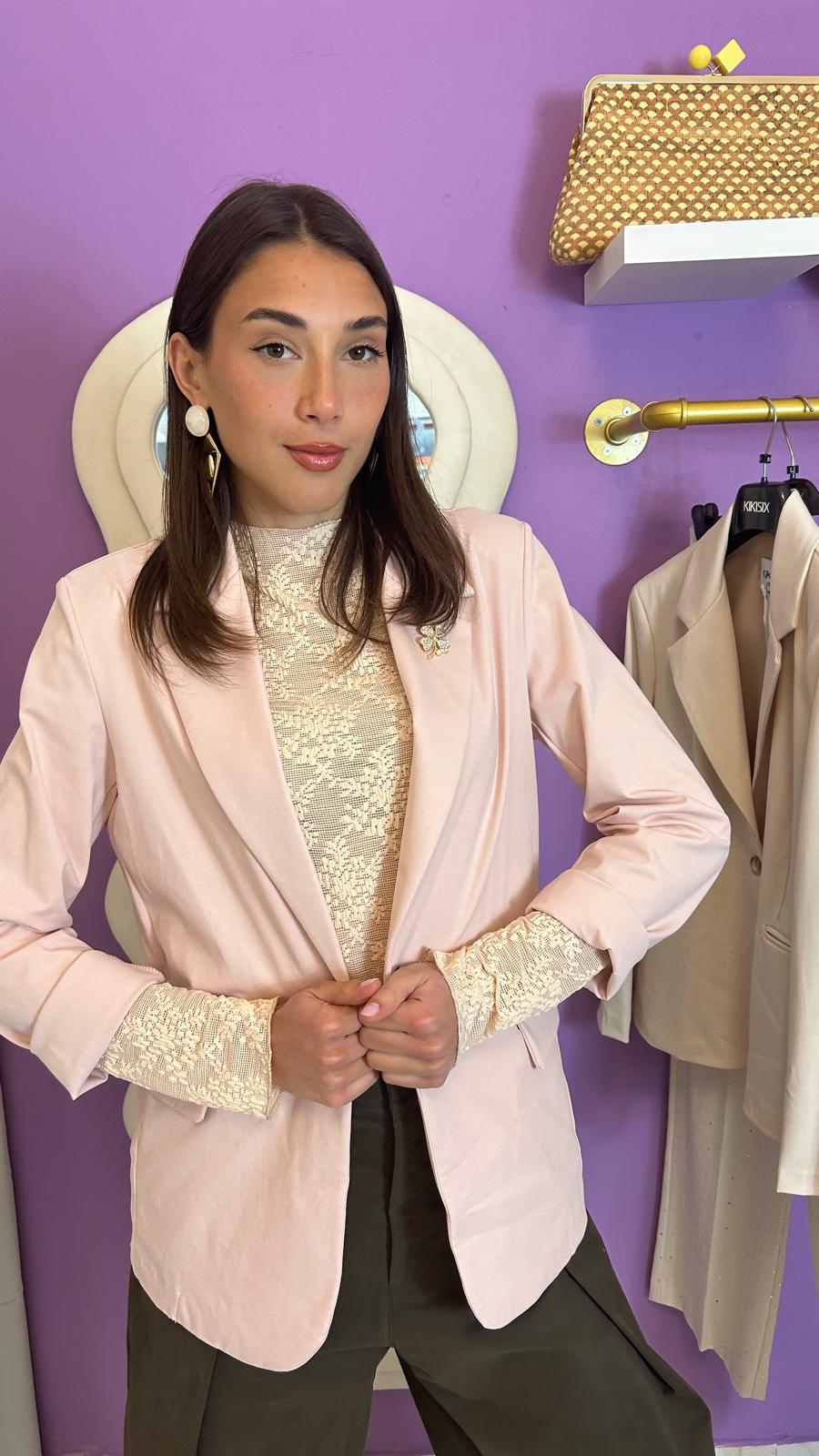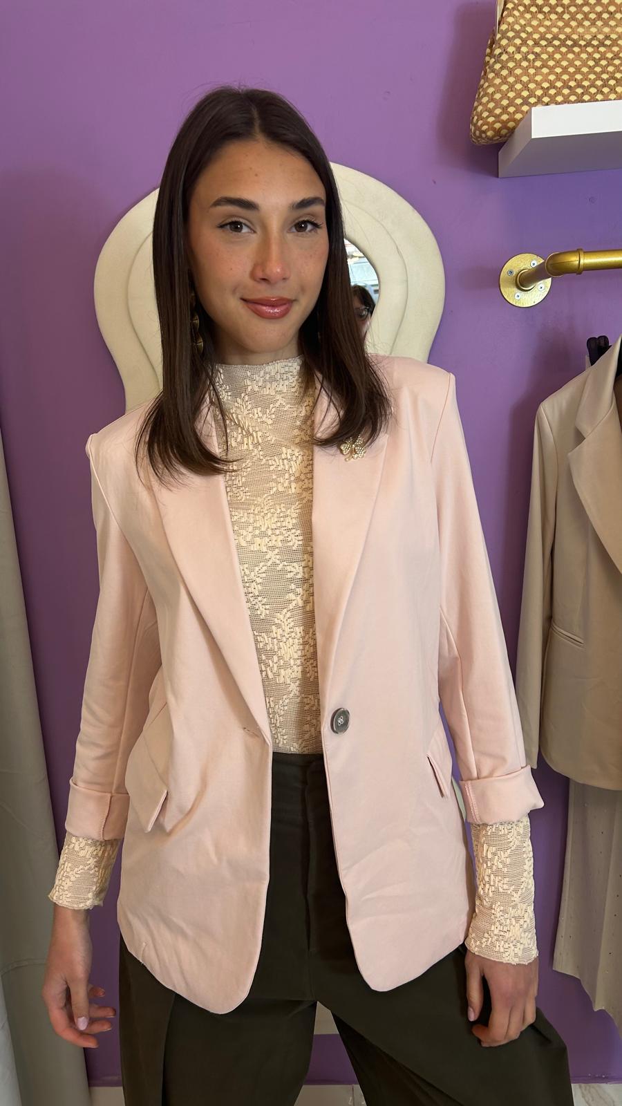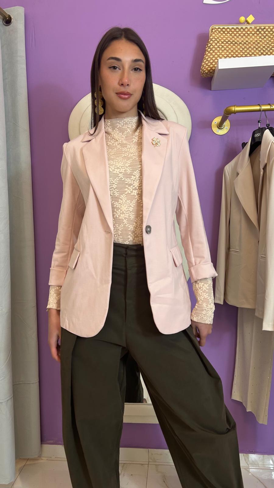 Giacca basic a un bottone in punto milano on tasche frontali, spalline imbottite a fit slim, con applicazione di spilla.