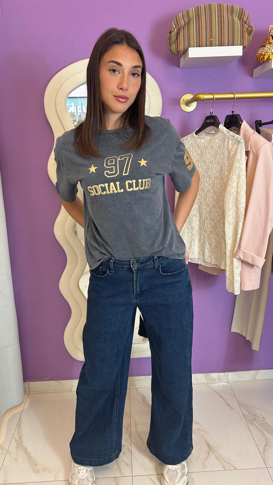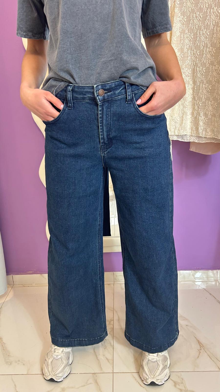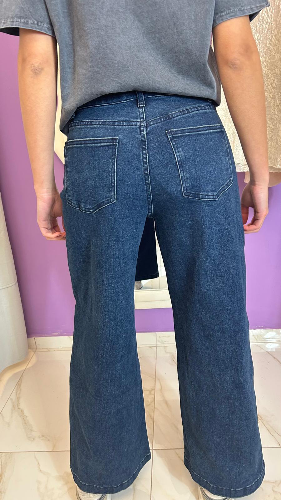 Pantalone in jeans Palazzo in blu scuro, tessuto elasticizzato, chiusura lampo con bottone. Con i passanti per mettere cinta. E tasche davanti e dietro.