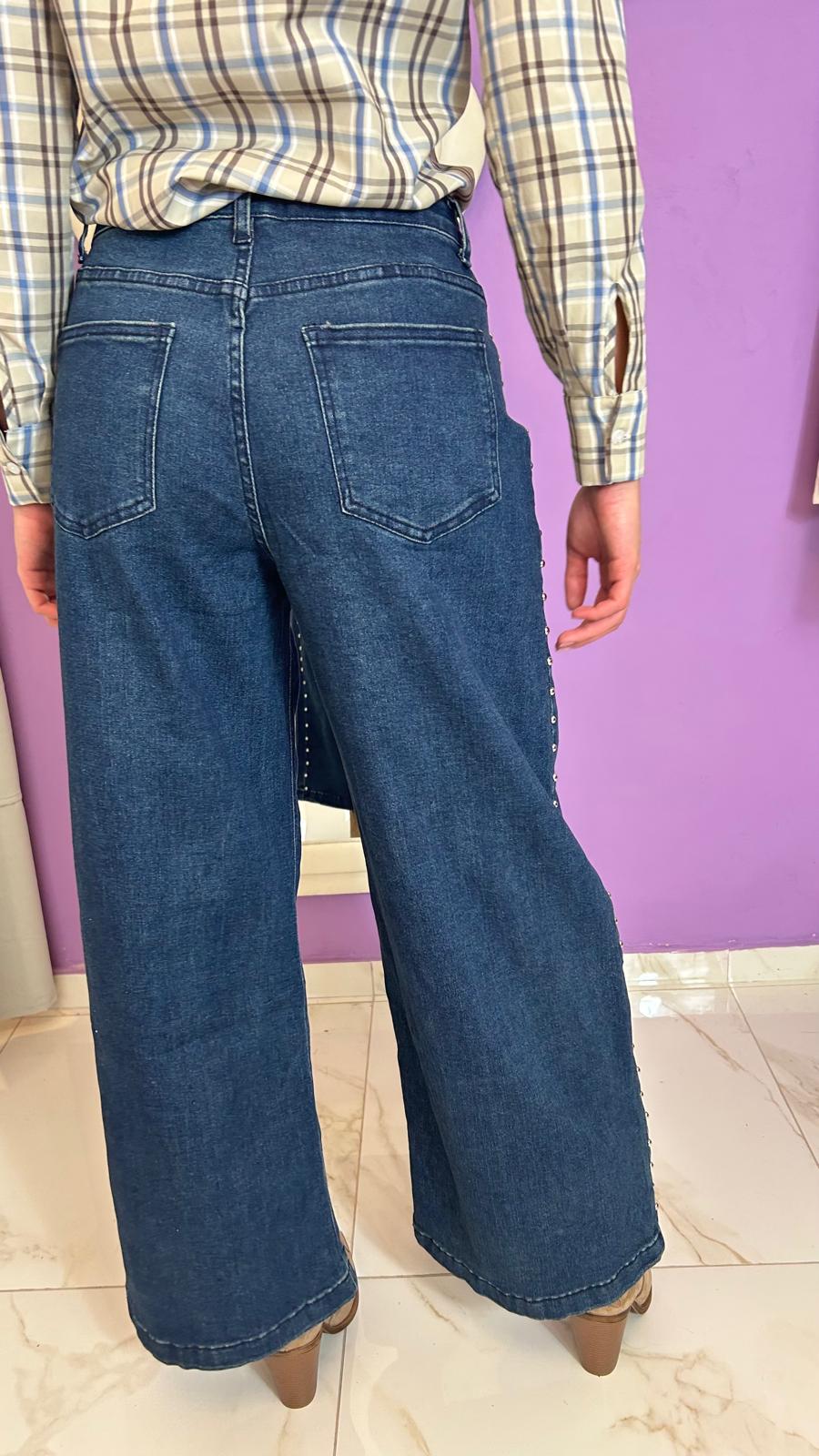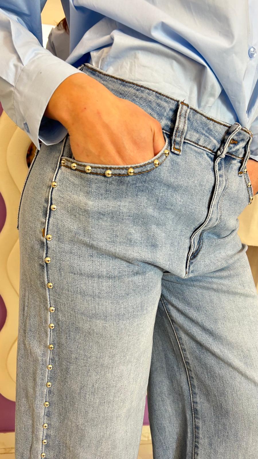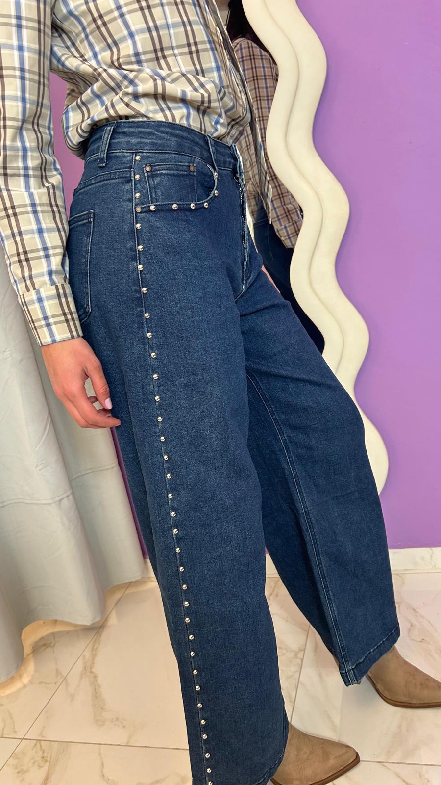 Jean a palazzo con borchie, con tasche dietro e avanti, chiusura lampo, tessuto elasticizzato,Â
