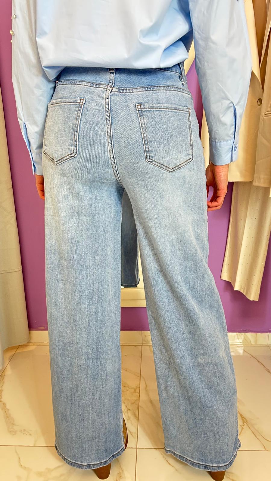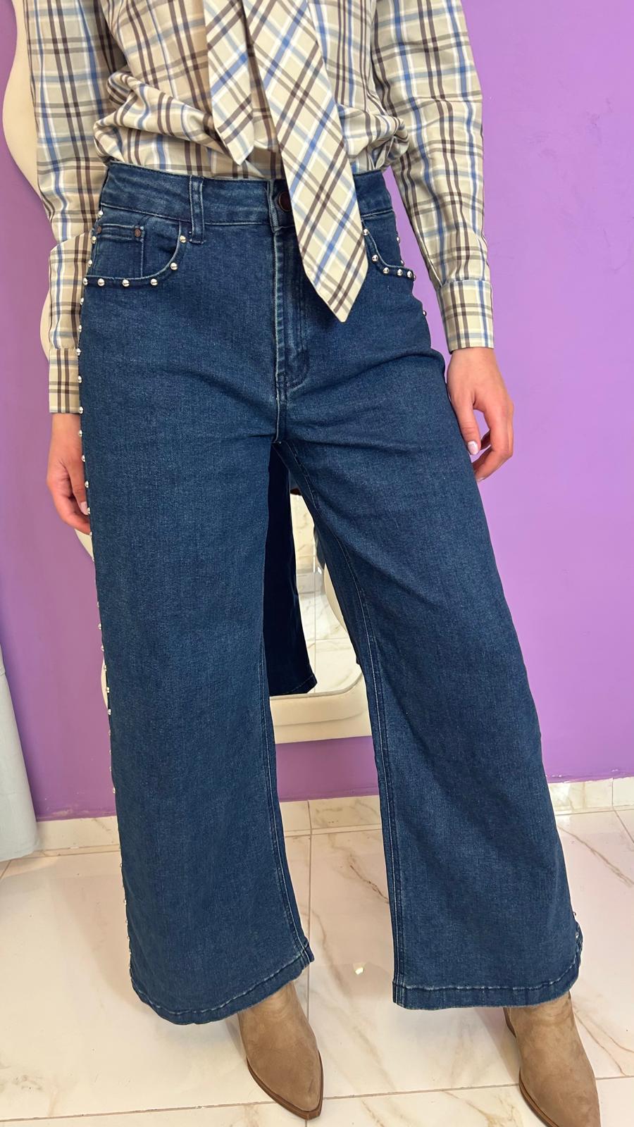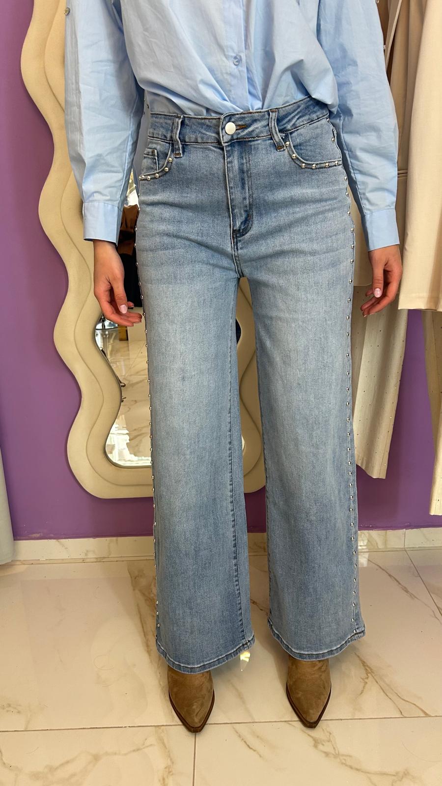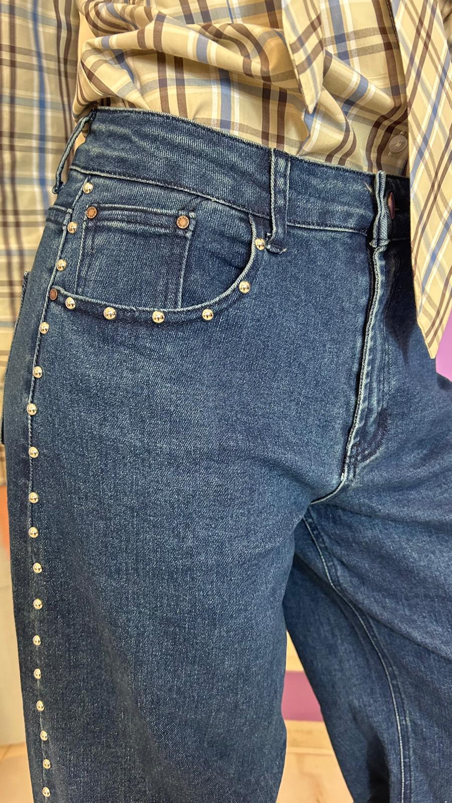 Jean a palazzo con borchie, con tasche dietro e avanti, chiusura lampo, tessuto elasticizzato,Â