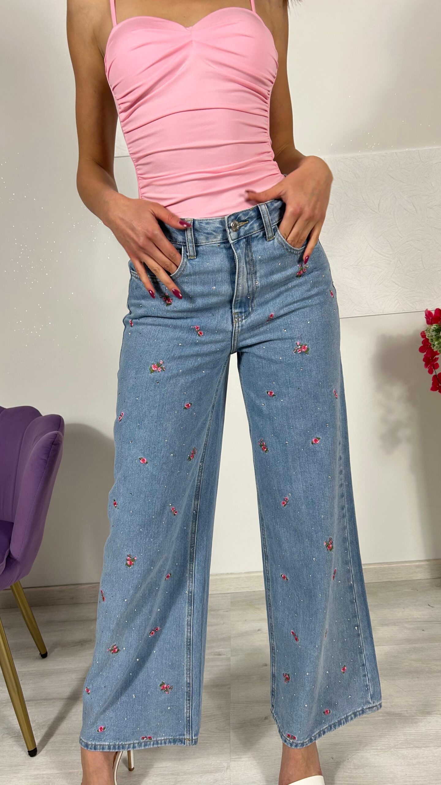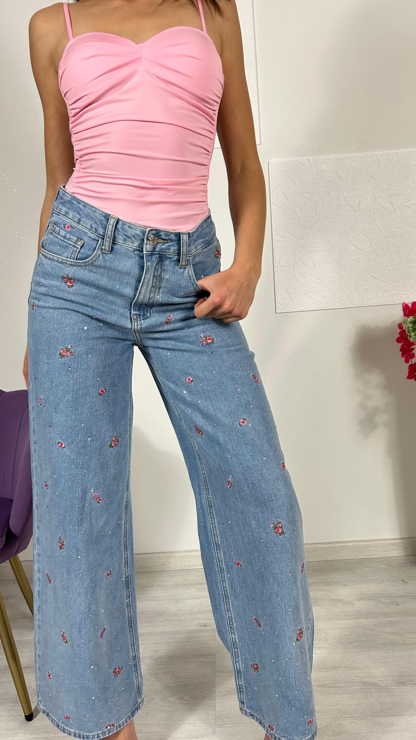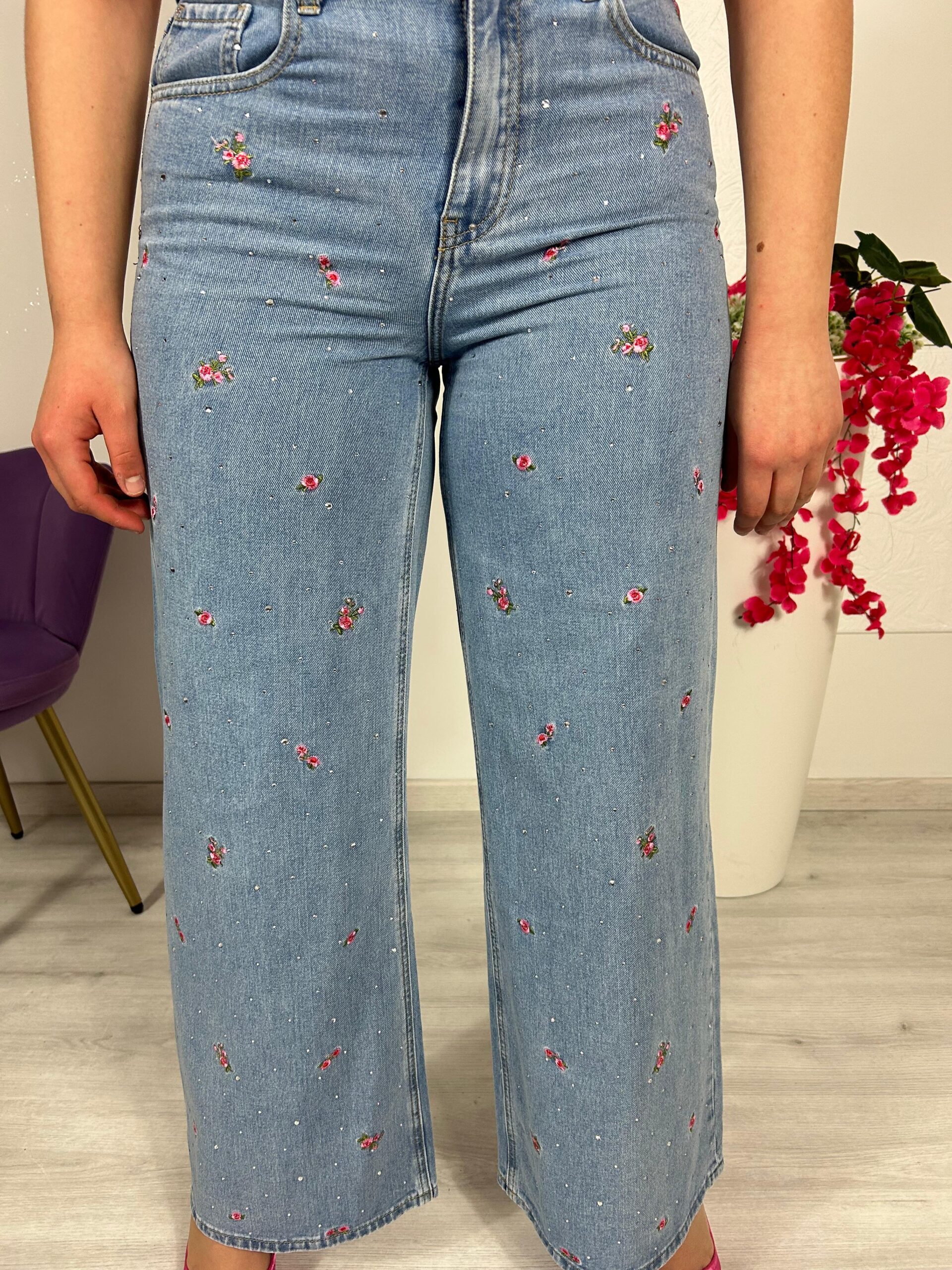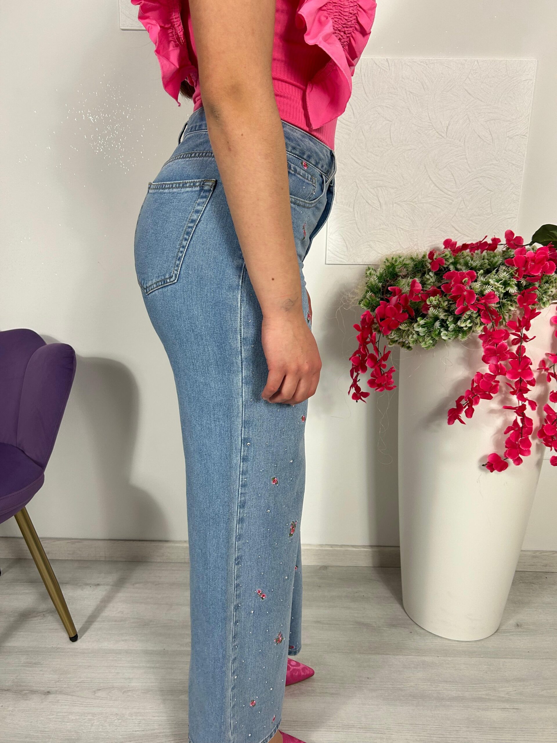 Jeans con decorazioni di strass e ricami di roselline ,elasticizzato vita alta, casual, con tasche laterali e anteriore con chiusura lampo.