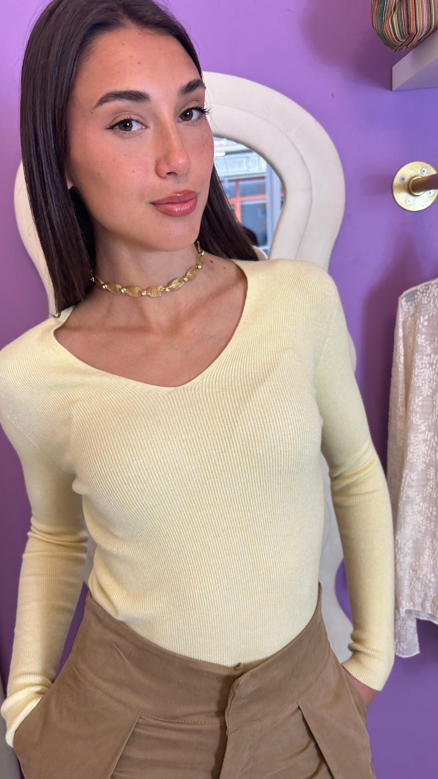 Maglia scollo a V in viscosa con maniche lunghe ,polsini a coste comoda ,casual .
