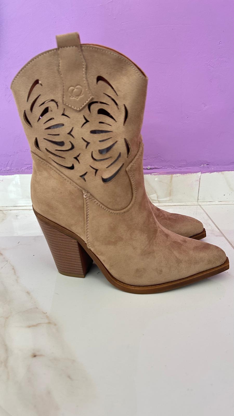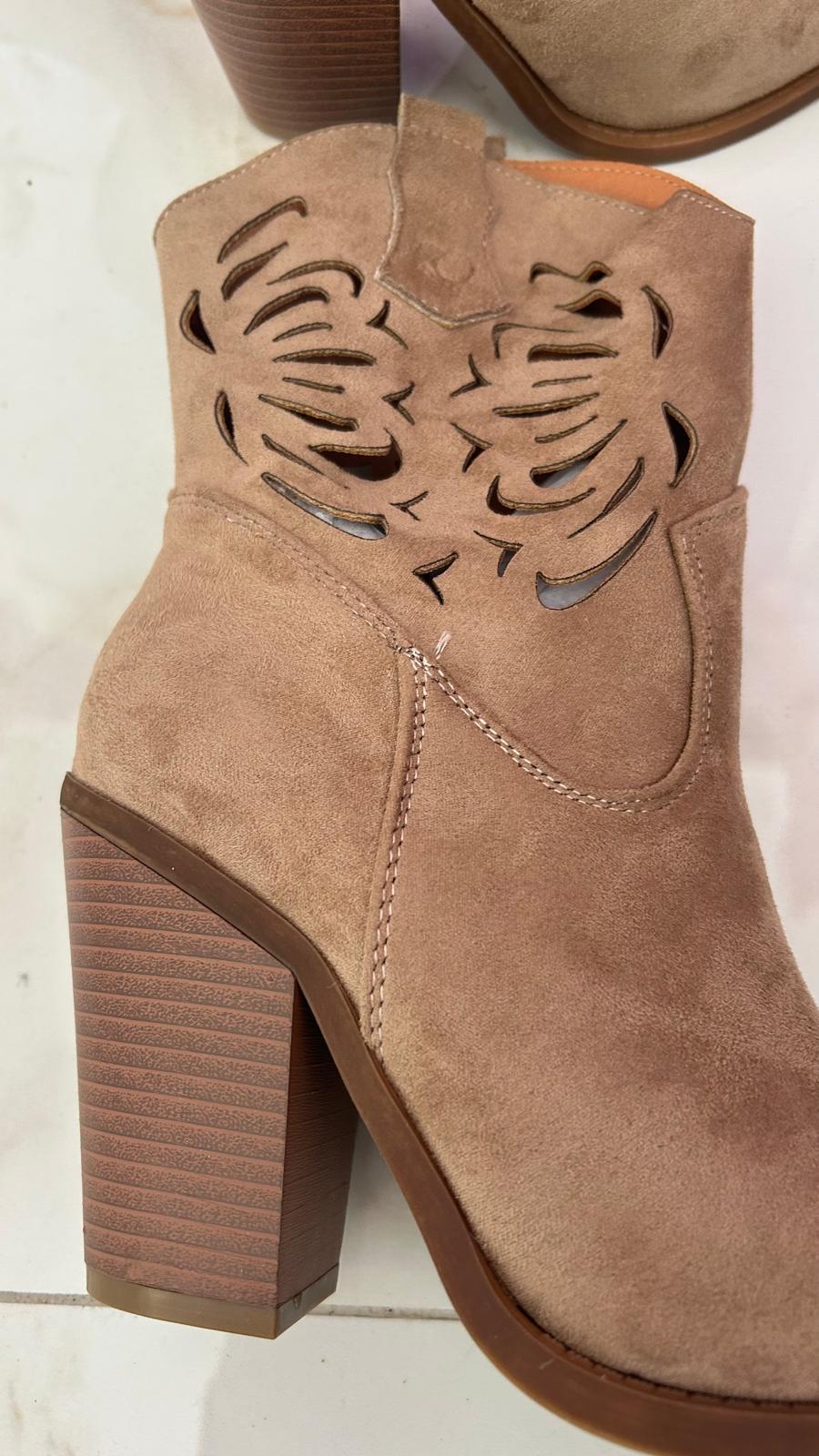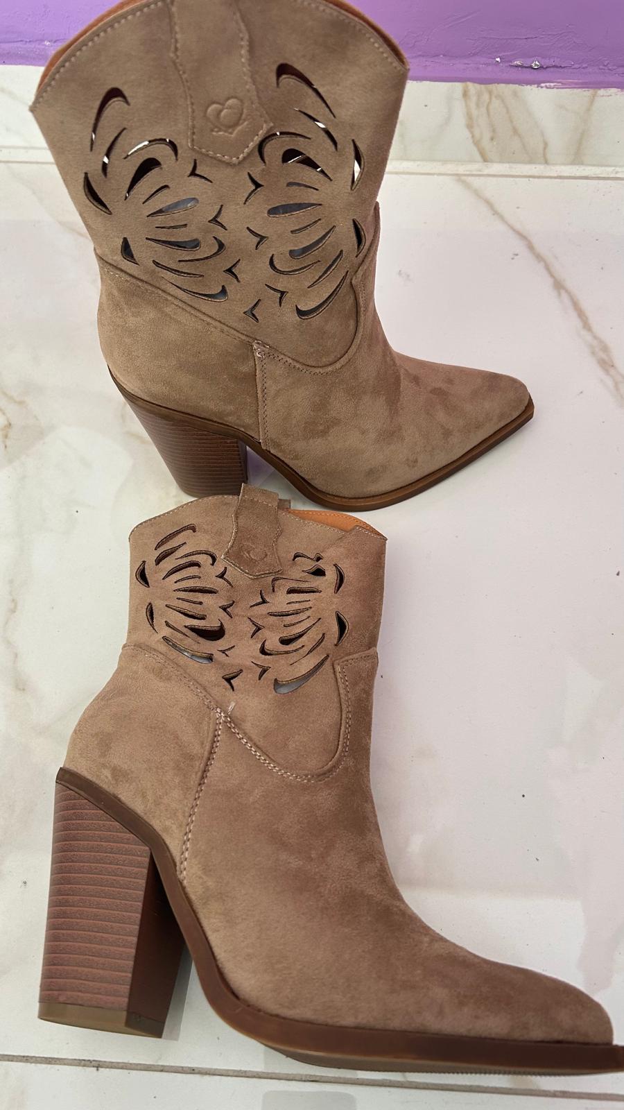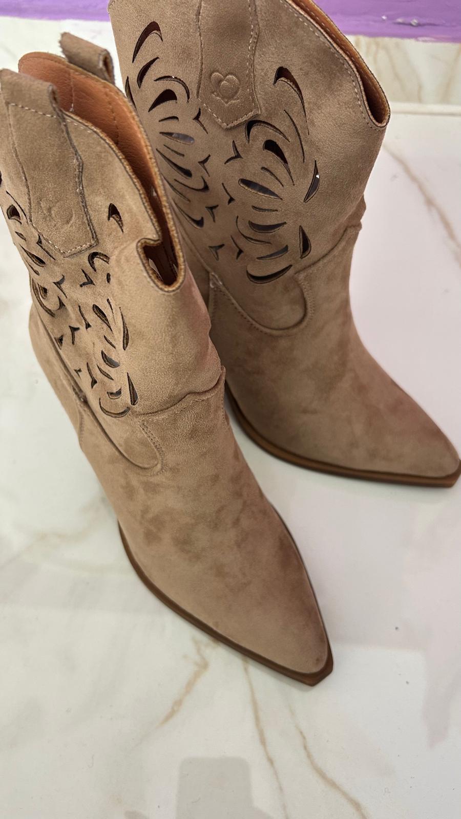 Texano corto con tacco largo 8 cm, a punta in eco scamosciato esterno, internamente con plantare in pelle, traforato con chiusura lampo di lato.