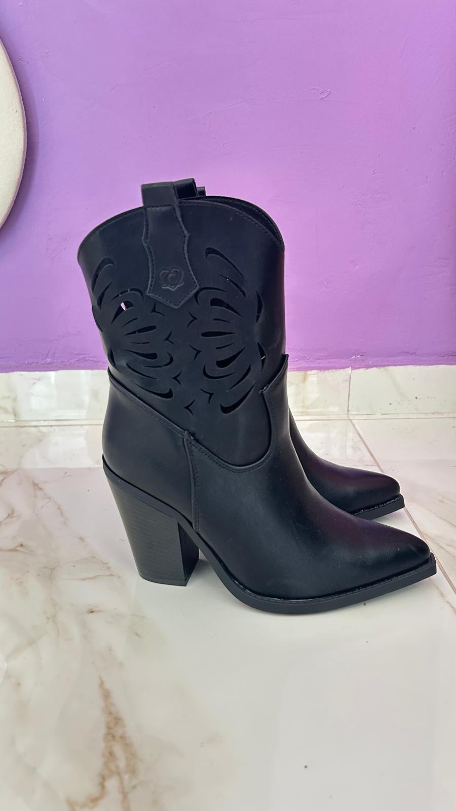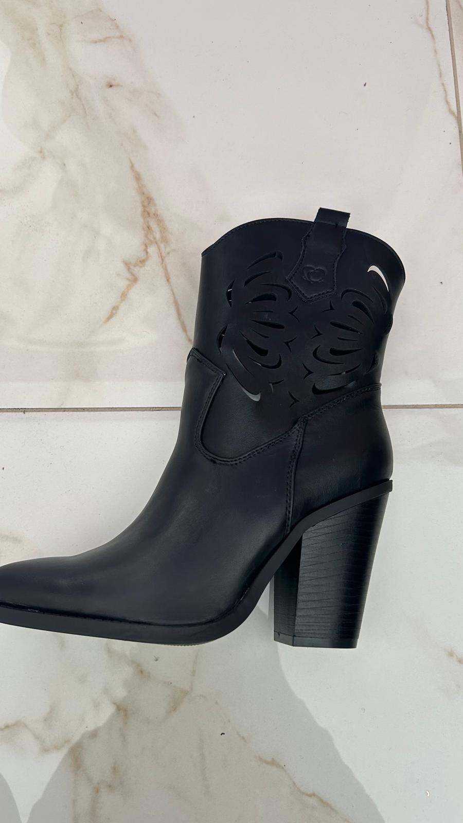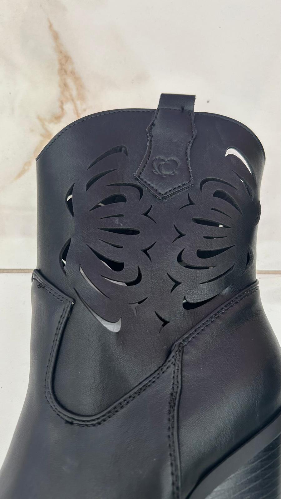 Texano corto traforato, con tacco 8 cm, in ecopelle fuori interno in pelle, con design a punta di Crichic, chiusura lampo di lato.