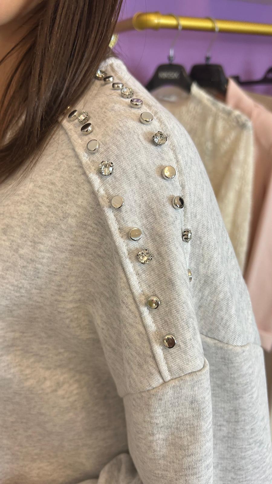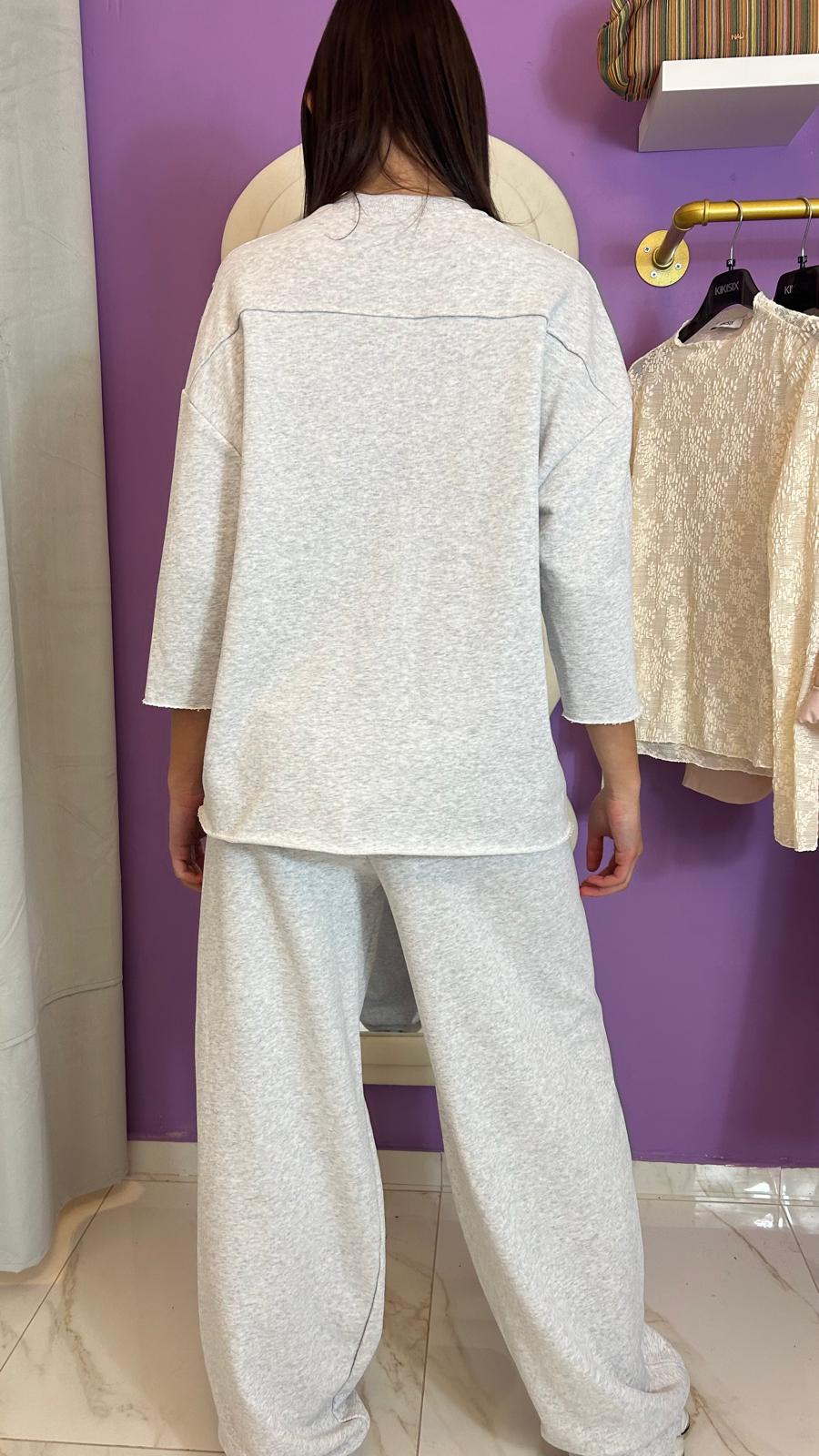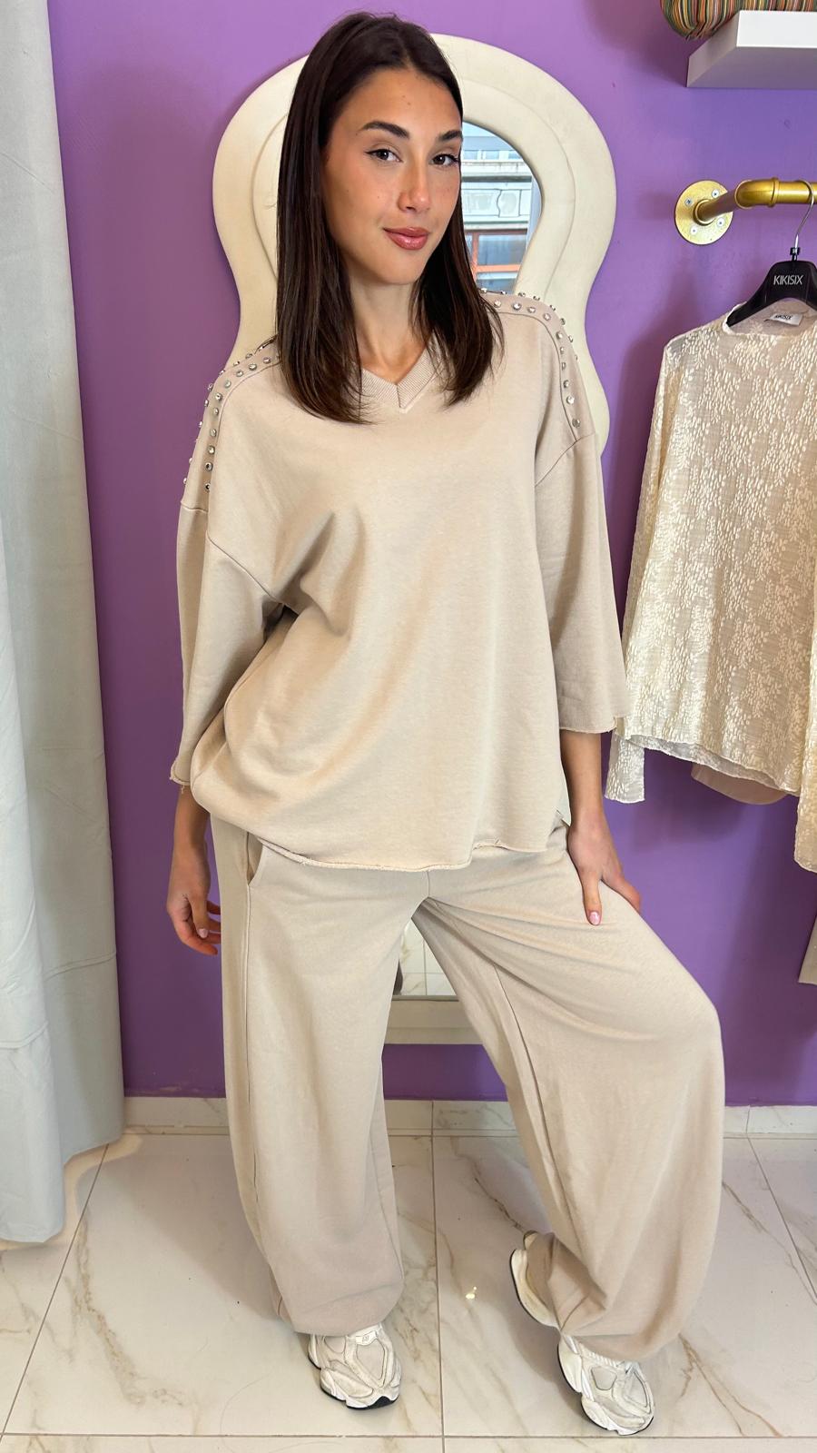 Tuta in felpa leggera, con decorazioni di impunture sulle spalle, manica media lunghezza,con pantalone over , morbido con tasche.